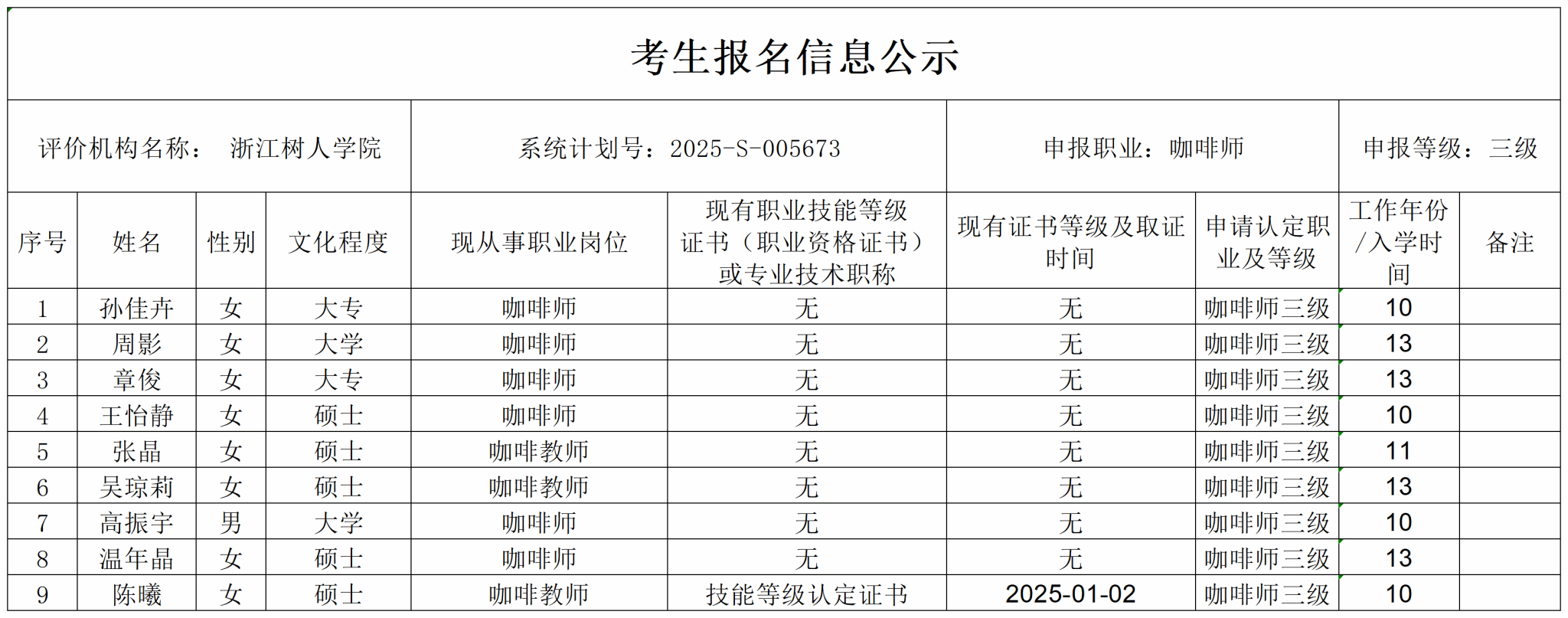 现将通过2025-S-005673批次咖啡师高级(三级)职业技能等级认定资格审核考生信息予以公示,公示期2025年8月1日至8月7日,如对公示情况有异议,请提供有效证据,并实名电话或书面联系公司职业技能等级认定中心。
