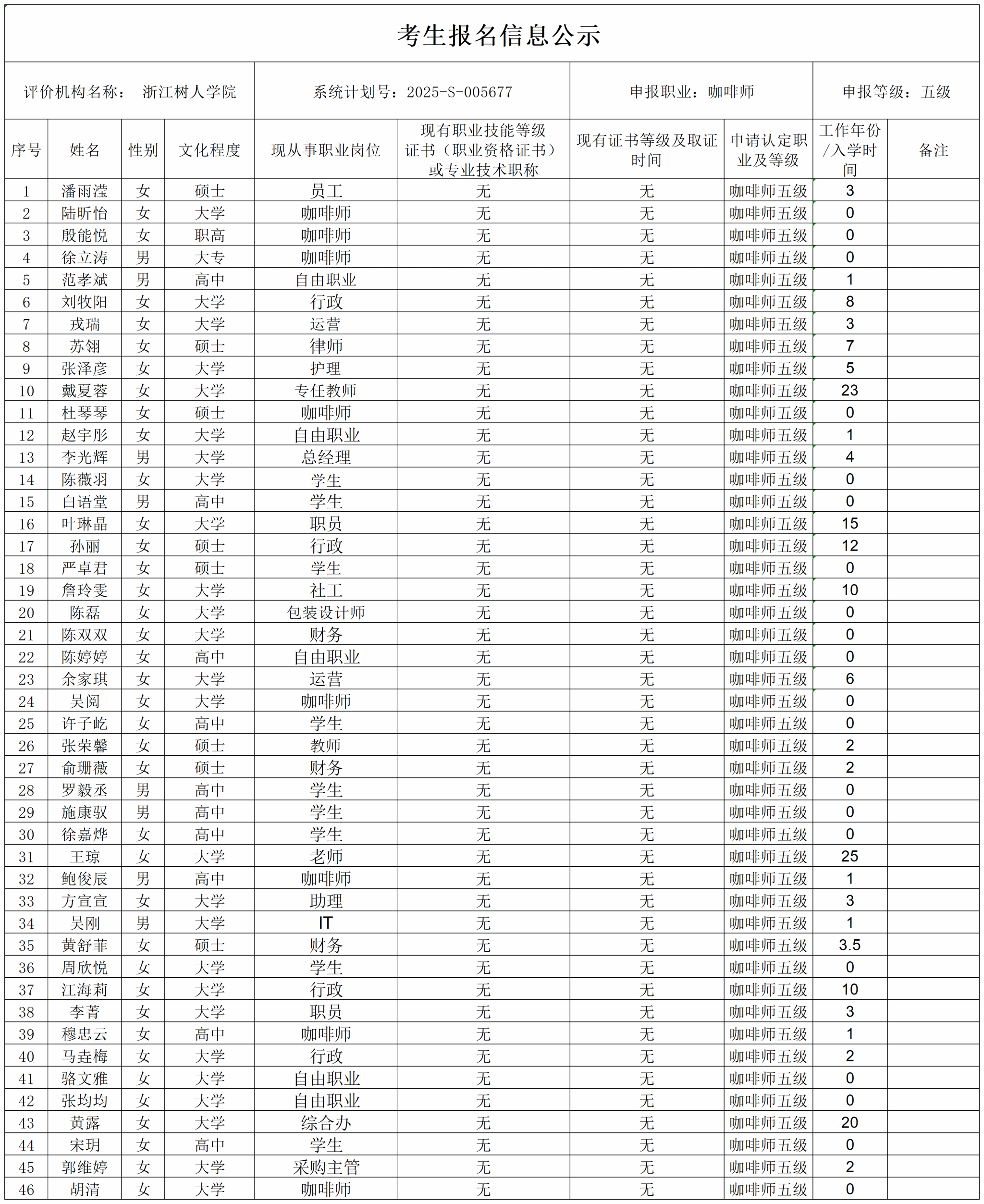 现将通过2025-S-005677批次咖啡师初级(五级)职业技能等级认定资格审核考生信息予以公示,公示期2025年8月1日至8月7日,如对公示情况有异议,请提供有效证据,并实名电话或书面联系公司职业技能等级认定中心。