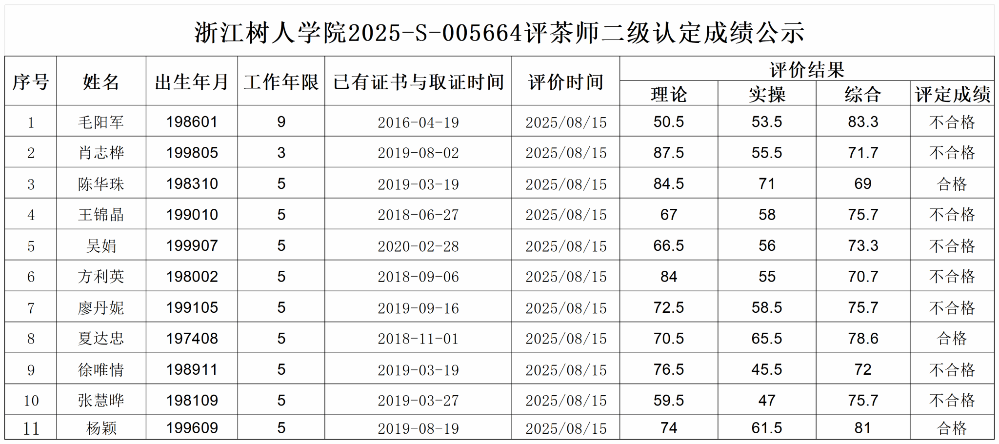 根据《浙江省人力资源和社会保障厅办公室关于印发<浙江省社会评价组织职业技能等级认定操作指南(试行)>的通知》,经审核,现将2025-S-005664批次评茶师二级职业技能等级认定成绩予以公示,公示期2025年8月20日至8月26日,如对公示情况有异议,请提供有效证据,并实名电话或书面联系公司职业技能等级认定中心。