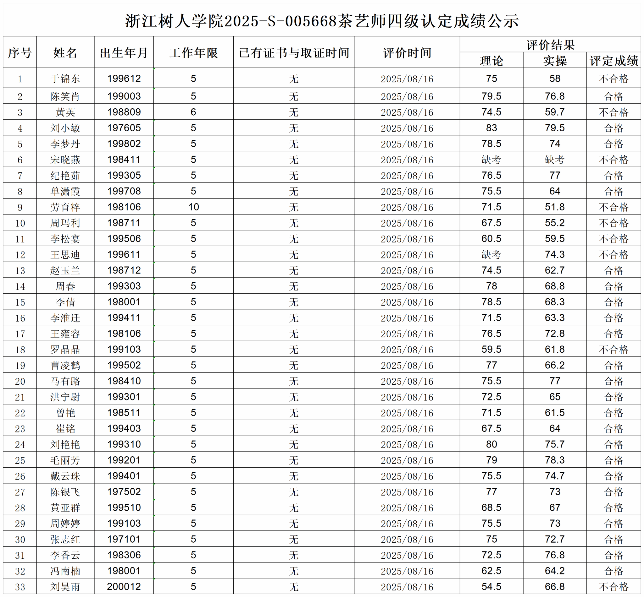 根据《浙江省人力资源和社会保障厅办公室关于印发<浙江省社会评价组织职业技能等级认定操作指南(试行)>的通知》,经审核,现将2025-S-005668批次茶艺师四级职业技能等级认定成绩予以公示,公示期2025年8月20日至8月26日,如对公示情况有异议,请提供有效证据,并实名电话或书面联系公司职业技能等级认定中心。
