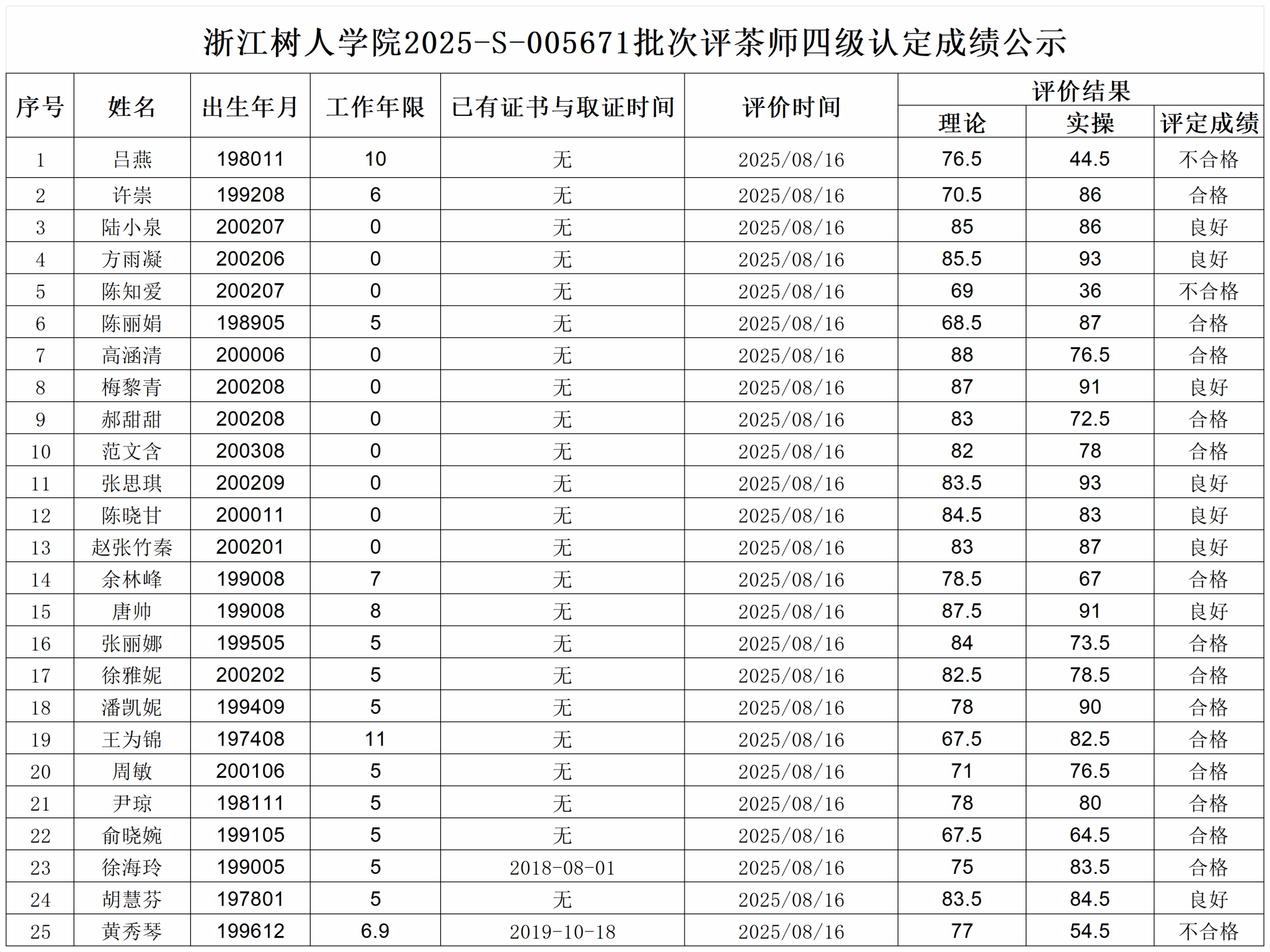 根据《浙江省人力资源和社会保障厅办公室关于印发<浙江省社会评价组织职业技能等级认定操作指南(试行)>的通知》,经审核,现将2025-S-005671批次评茶师四级职业技能等级认定成绩予以公示,公示期2025年8月20日至8月26日,如对公示情况有异议,请提供有效证据,并实名电话或书面联系公司职业技能等级认定中心。