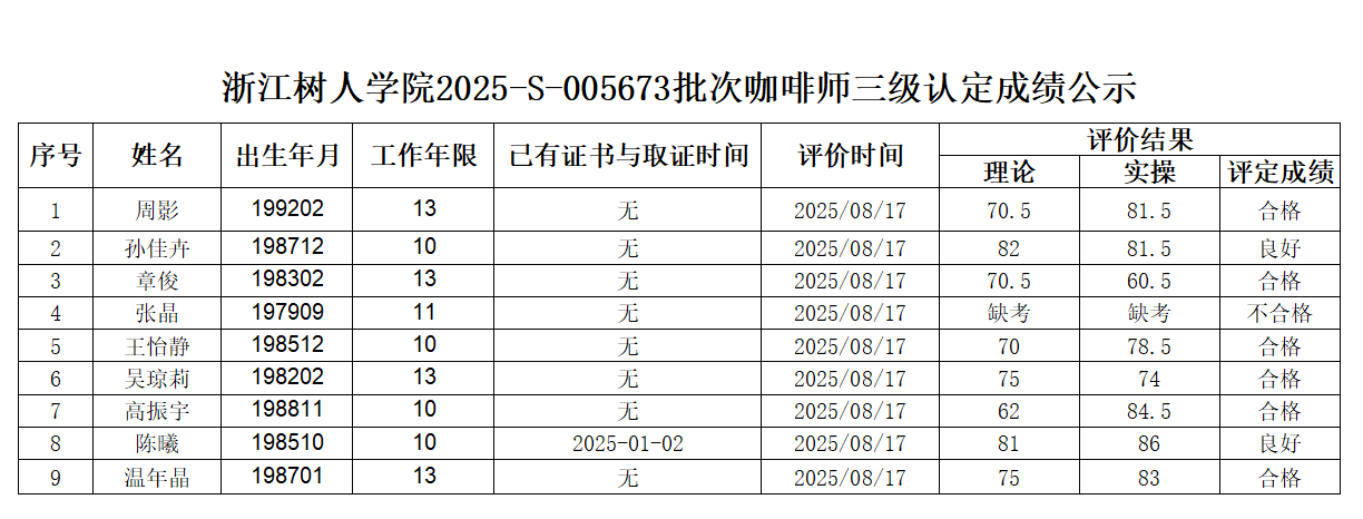 根据《浙江省人力资源和社会保障厅办公室关于印发<浙江省社会评价组织职业技能等级认定操作指南(试行)>的通知》,经审核,现将2025-S-005673批次咖啡师三级职业技能等级认定成绩予以公示,公示期2025年8月20日至8月26日,如对公示情况有异议,请提供有效证据,并实名电话或书面联系公司职业技能等级认定中心。