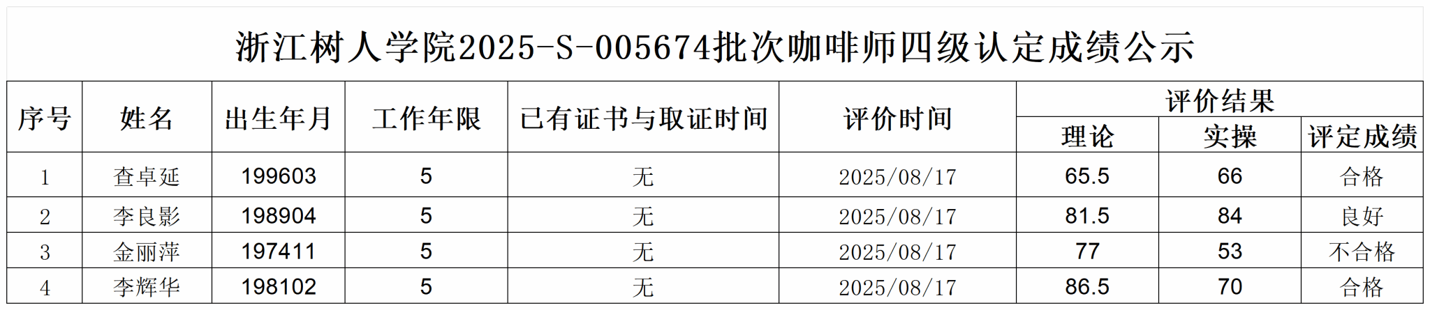 根据《浙江省人力资源和社会保障厅办公室关于印发<浙江省社会评价组织职业技能等级认定操作指南(试行)>的通知》,经审核,现将2025-S-005674批次咖啡师四级职业技能等级认定成绩予以公示,公示期2025年8月20日至8月26日,如对公示情况有异议,请提供有效证据,并实名电话或书面联系公司职业技能等级认定中心。