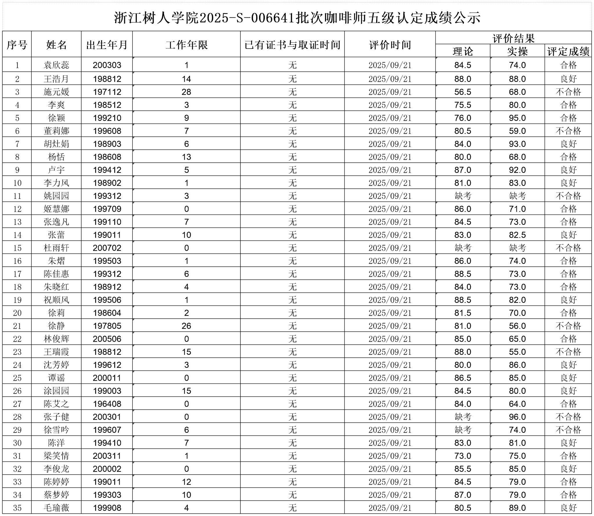 根据《浙江省人力资源和社会保障厅办公室关于印发<浙江省社会评价组织职业技能等级认定操作指南(试行)>的通知》,经审核,现将2025-S-006641批次咖啡师五级职业技能等级认定成绩予以公示,公示期2025年9月24日至9月30日,如对公示情况有异议,请提供有效证据,并实名电话或书面联系公司职业技能等级认定中心。
