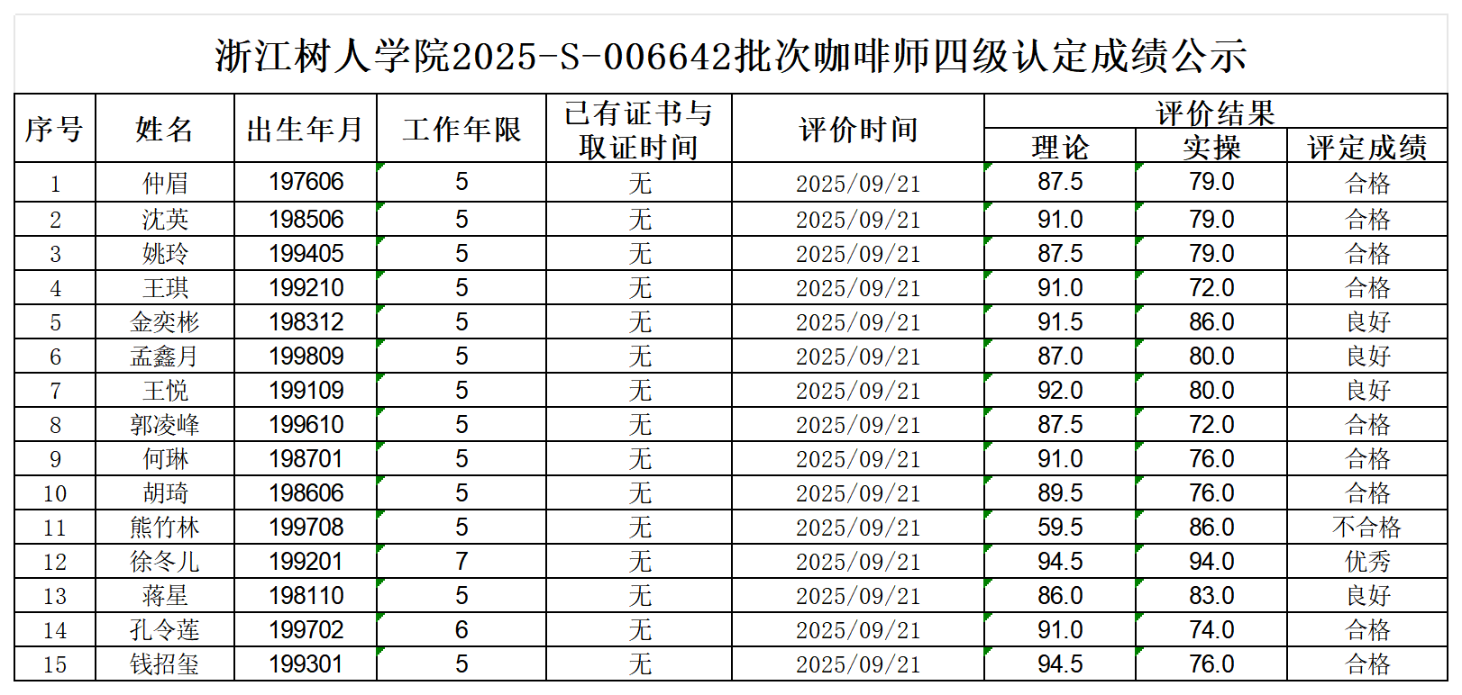 根据《浙江省人力资源和社会保障厅办公室关于印发<浙江省社会评价组织职业技能等级认定操作指南(试行)>的通知》,经审核,现将2025-S-006642批次咖啡师四级职业技能等级认定成绩予以公示,公示期2025年9月24日至9月30日,如对公示情况有异议,请提供有效证据,并实名电话或书面联系公司职业技能等级认定中心。