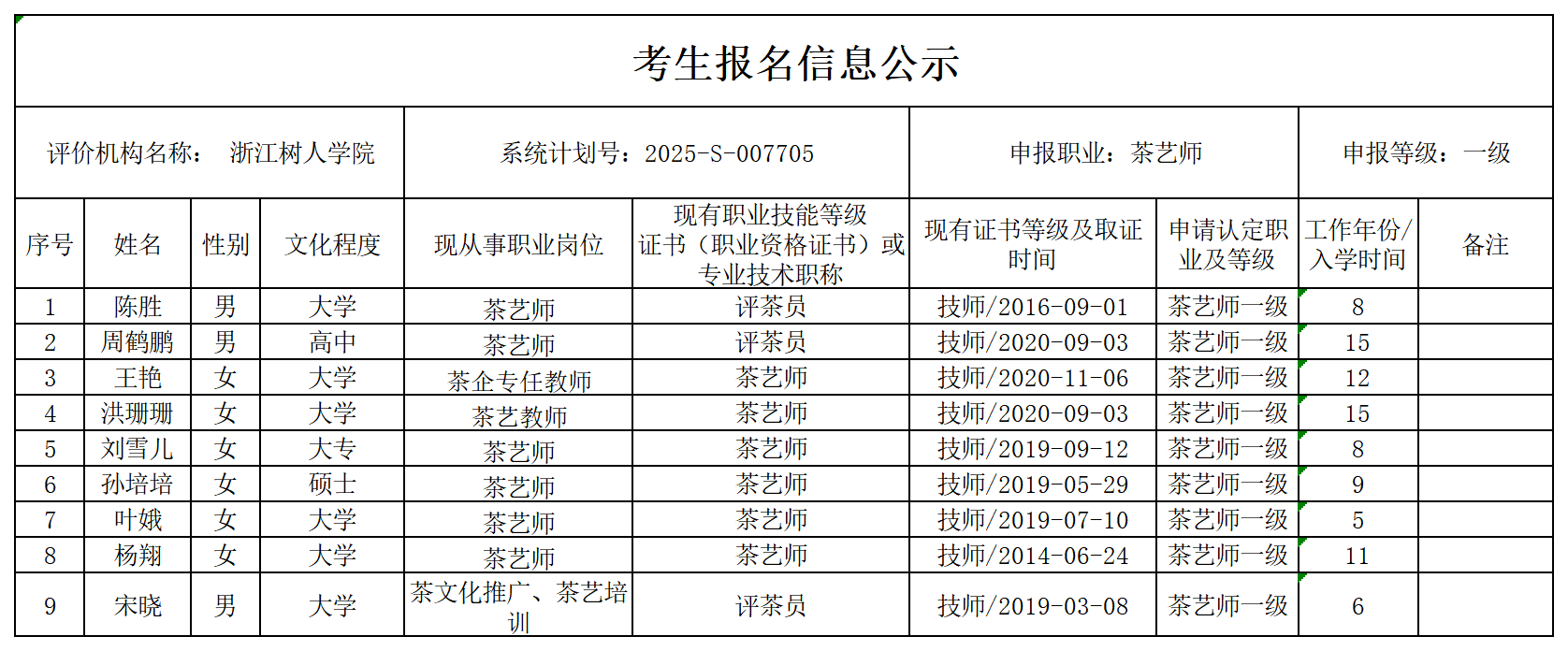 现将通过2025-S-007705批次茶艺师高级技师(一级)职业技能等级认定资格审核考生信息予以公示,公示期2025年10月11日至10月17日,如对公示情况有异议,请提供有效证据,并实名电话或书面联系公司职业技能等级认定中心。