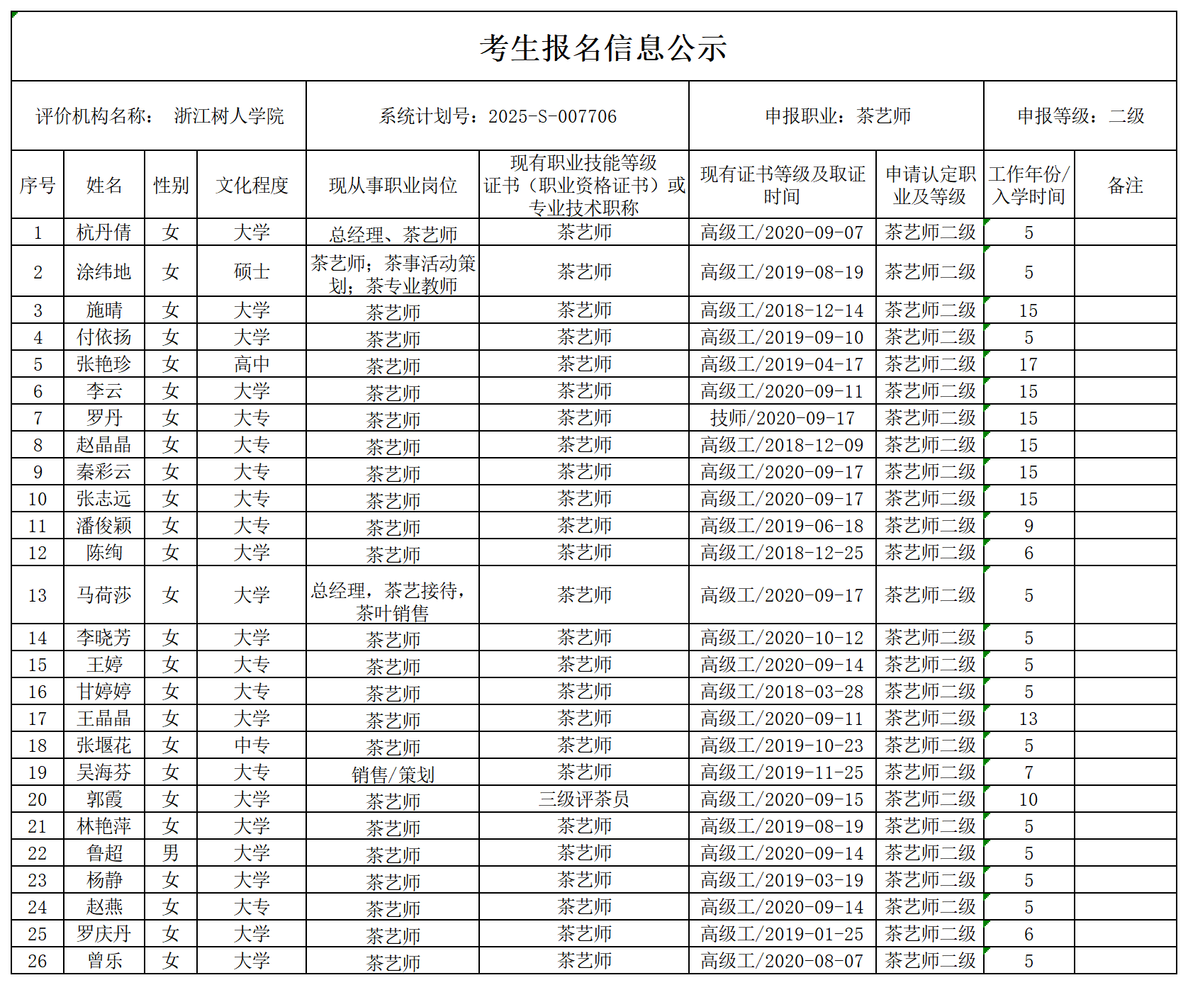 现将通过2025-S-007706批次茶艺师技师(二级)职业技能等级认定资格审核考生信息予以公示,公示期2025年10月11日至10月17日,如对公示情况有异议,请提供有效证据,并实名电话或书面联系公司职业技能等级认定中心。