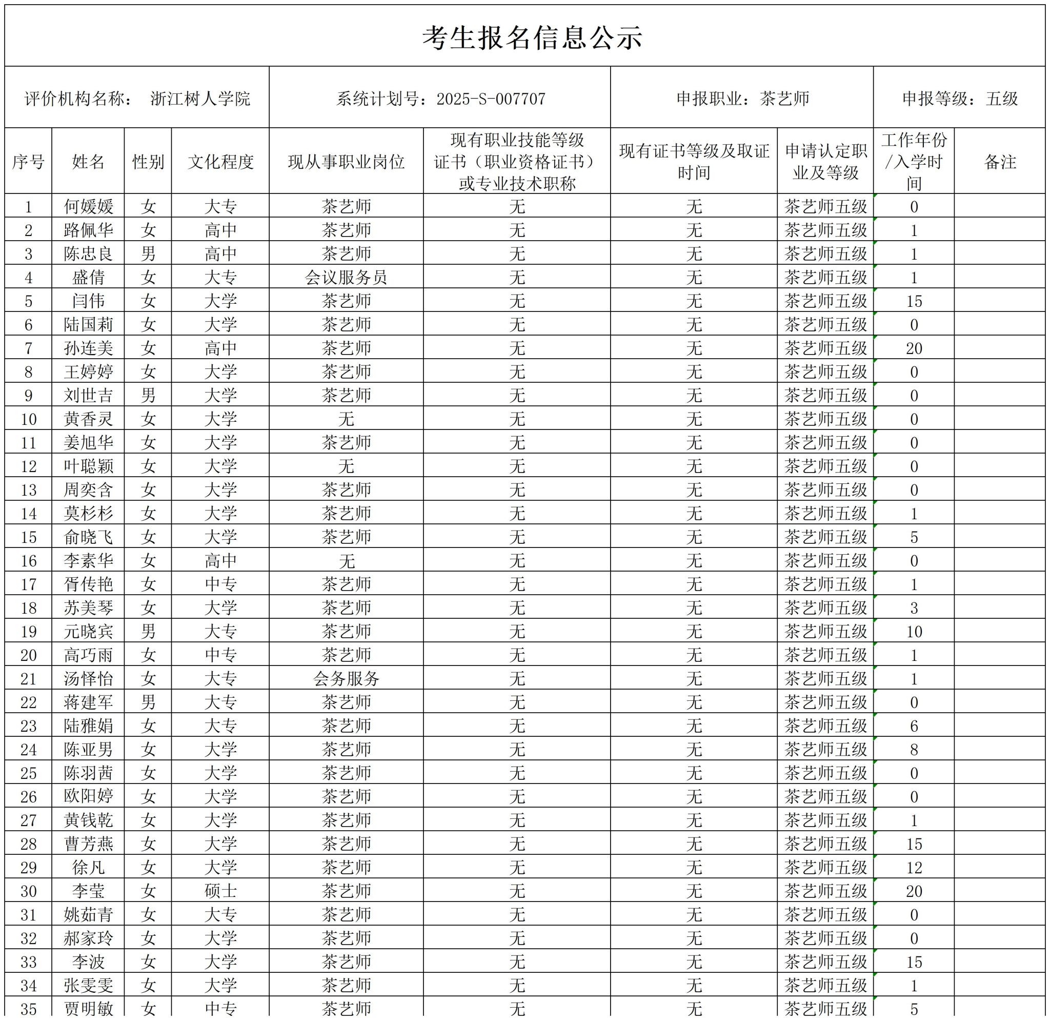 现将通过2025-S-007707批次茶艺师初级工(五级)职业技能等级认定资格审核考生信息予以公示,公示期2025年10月11日至10月17日,如对公示情况有异议,请提供有效证据,并实名电话或书面联系公司职业技能等级认定中心。