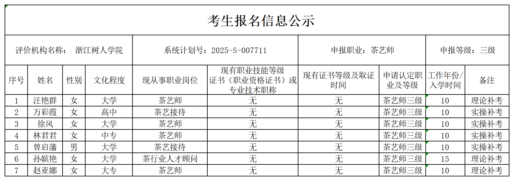 现将通过2025-S-007711批次茶艺师高级工(三级)职业技能等级认定资格审核考生信息予以公示,公示期2025年10月11日至10月17日,如对公示情况有异议,请提供有效证据,并实名电话或书面联系公司职业技能等级认定中心。