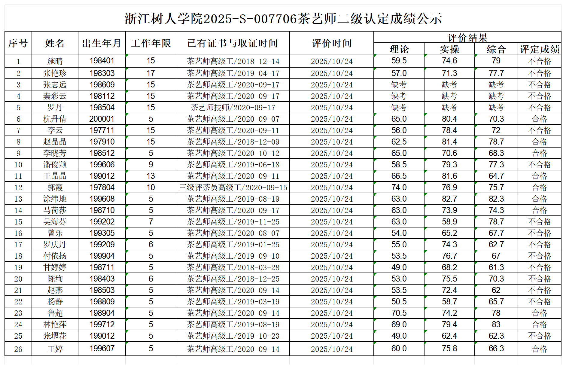 根据《浙江省人力资源和社会保障厅办公室关于印发<浙江省社会评价组织职业技能等级认定操作指南(试行)>的通知》,经审核,现将2025-S-007706批次茶艺师二级职业技能等级认定成绩予以公示,公示期2025年10月31日至11月6日,如对公示情况有异议,请提供有效证据,并实名电话或书面联系公司职业技能等级认定中心。