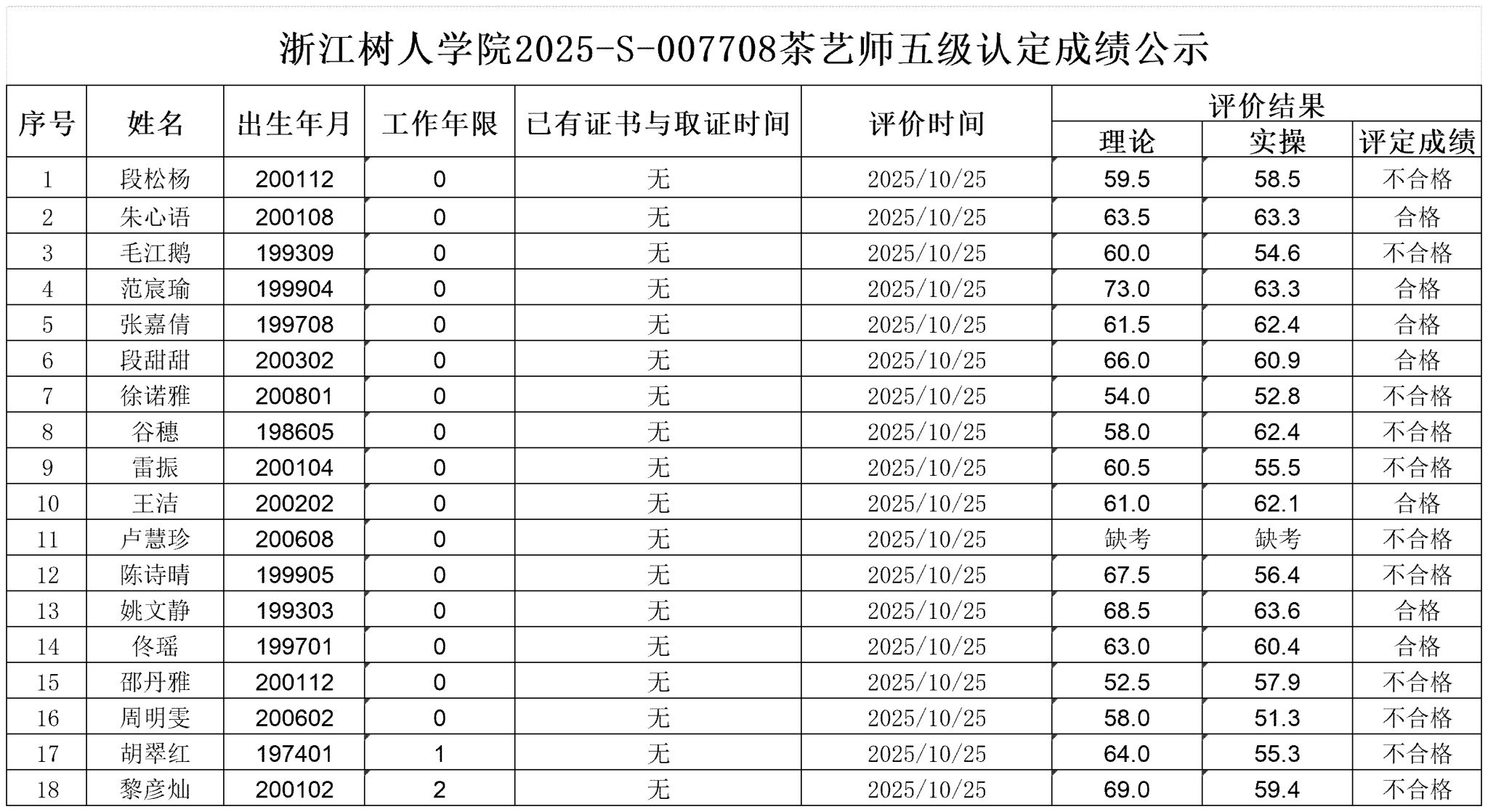 根据《浙江省人力资源和社会保障厅办公室关于印发<浙江省社会评价组织职业技能等级认定操作指南(试行)>的通知》,经审核,现将2025-S-007708(二)批次茶艺师五级职业技能等级认定成绩予以公示,公示期2025年10月31日至11月6日,如对公示情况有异议,请提供有效证据,并实名电话或书面联系公司职业技能等级认定中心。