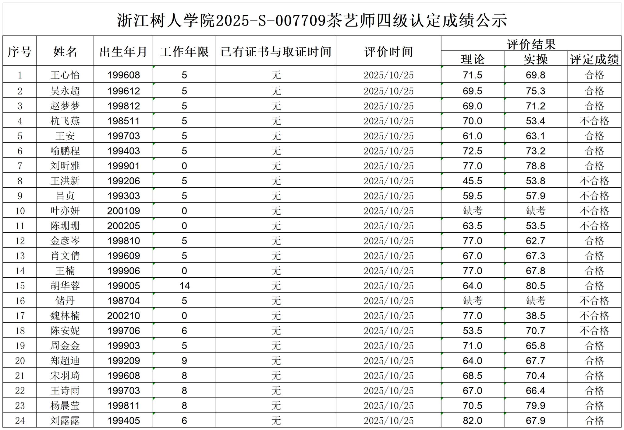 根据《浙江省人力资源和社会保障厅办公室关于印发<浙江省社会评价组织职业技能等级认定操作指南(试行)>的通知》,经审核,现将2025-S-007709批次茶艺师四级职业技能等级认定成绩予以公示,公示期2025年10月31日至11月6日,如对公示情况有异议,请提供有效证据,并实名电话或书面联系公司职业技能等级认定中心。