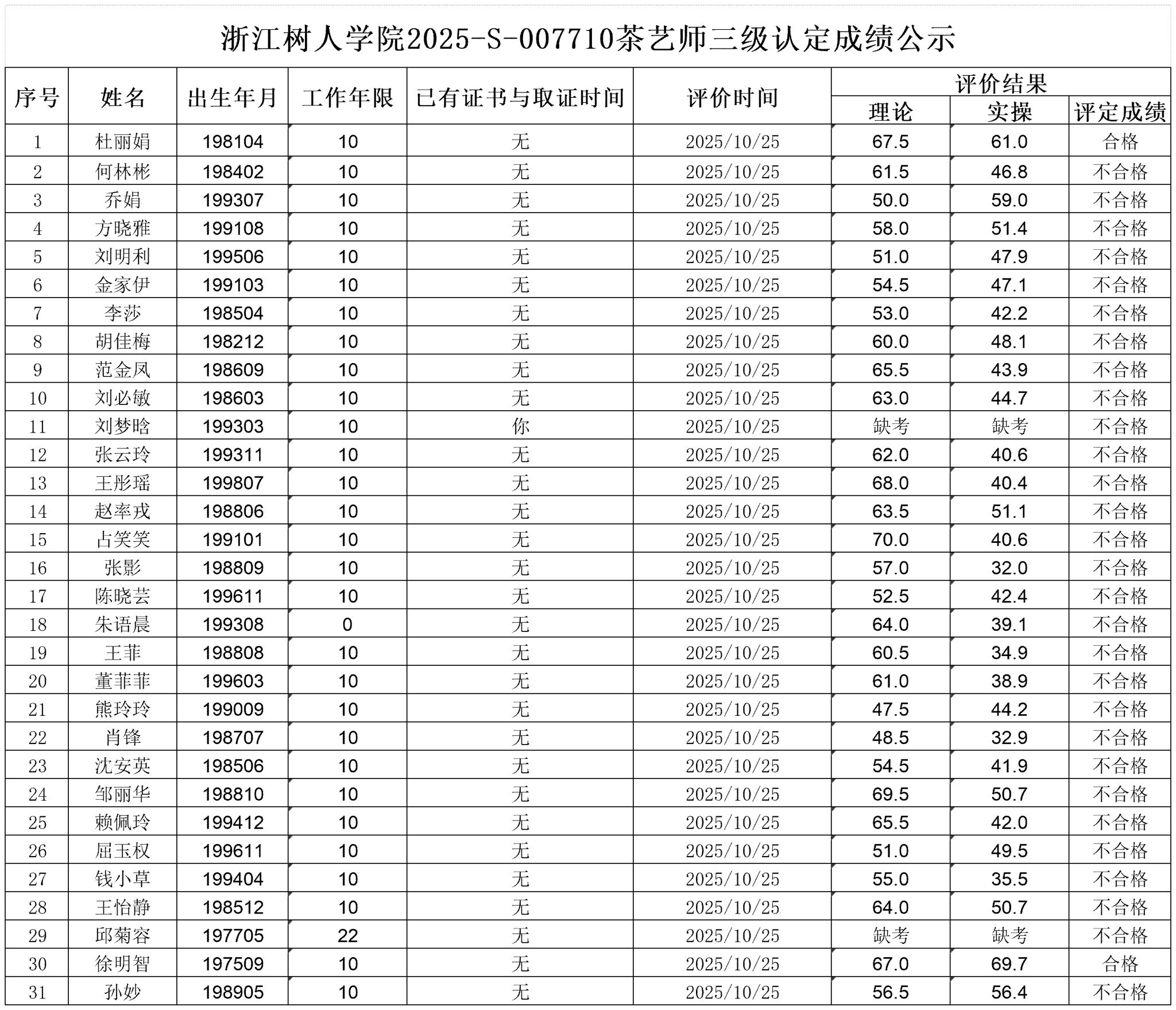 根据《浙江省人力资源和社会保障厅办公室关于印发<浙江省社会评价组织职业技能等级认定操作指南(试行)>的通知》,经审核,现将2025-S-007710批次茶艺师三级职业技能等级认定成绩予以公示,公示期2025年10月31日至11月6日,如对公示情况有异议,请提供有效证据,并实名电话或书面联系公司职业技能等级认定中心。