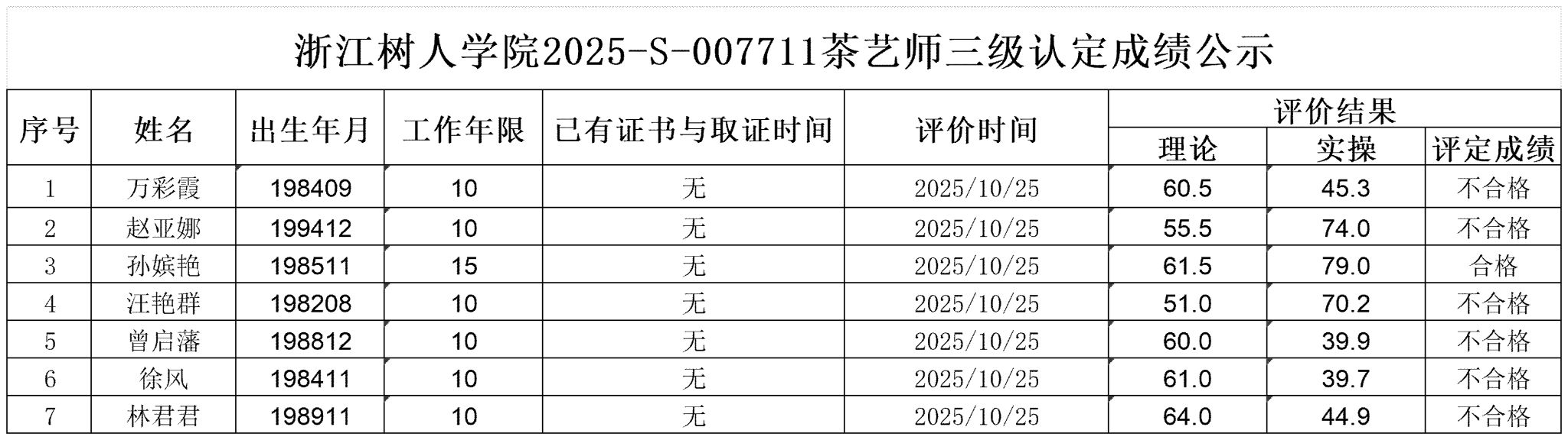 根据《浙江省人力资源和社会保障厅办公室关于印发<浙江省社会评价组织职业技能等级认定操作指南(试行)>的通知》,经审核,现将2025-S-007711批次茶艺师三级职业技能等级认定成绩予以公示,公示期2025年10月31日至11月6日,如对公示情况有异议,请提供有效证据,并实名电话或书面联系公司职业技能等级认定中心。